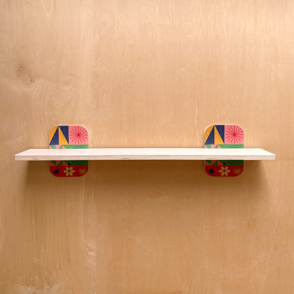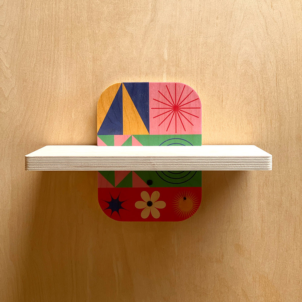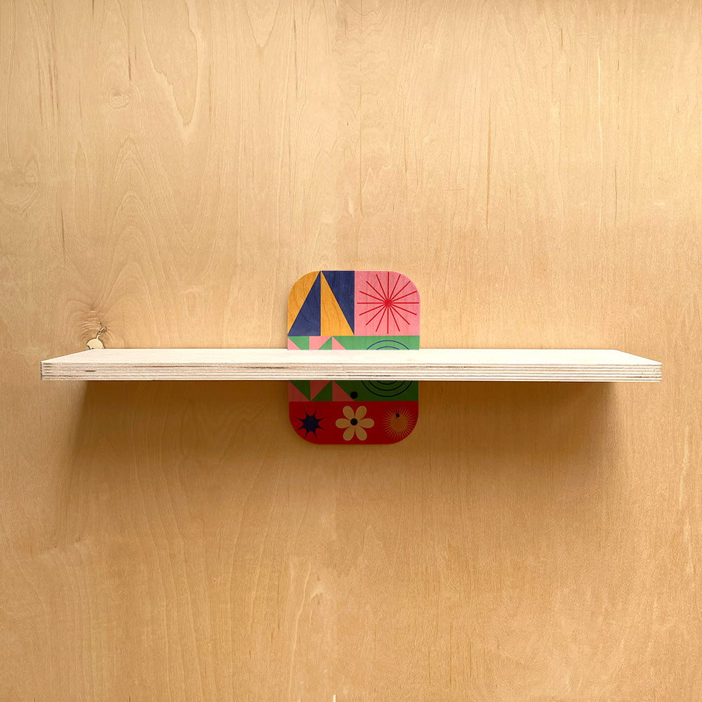 Now available in 12", 24", and 36" widths, each shelf features a 6" depth — the perfect platform for displaying books, plants, and decorative accents in any room. The real standout? Sturdy wall brackets, accented with your choice of three exclusive geometric prints that bring a modern artistic touch to everyday function.