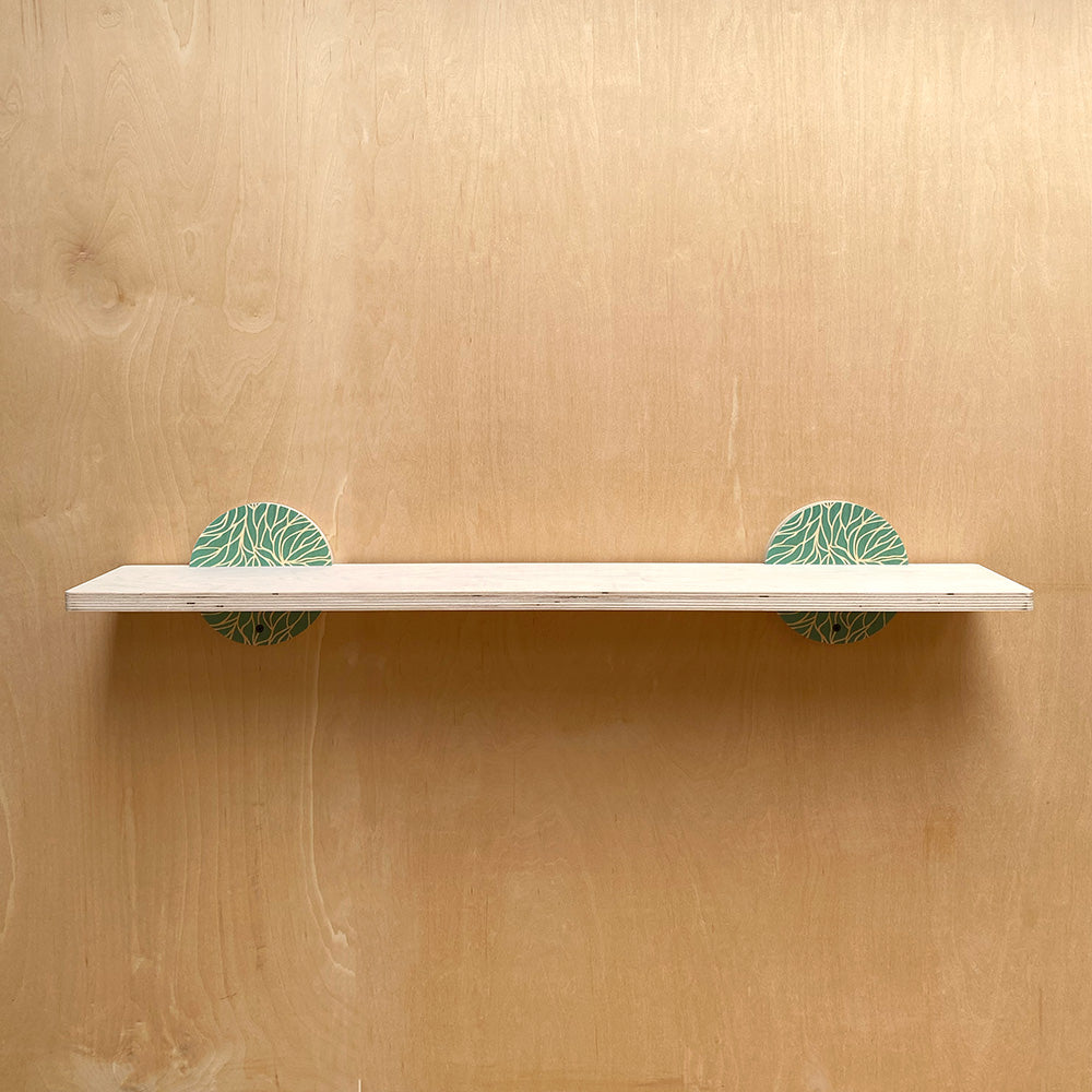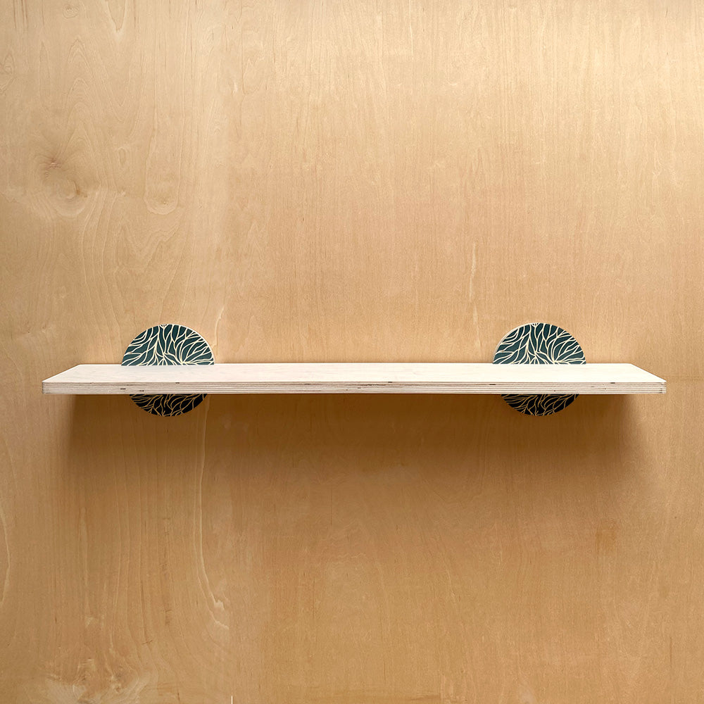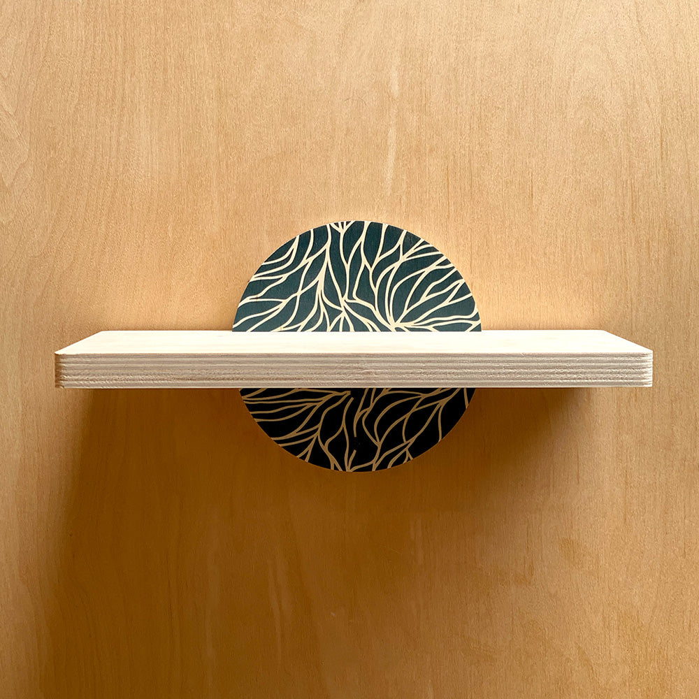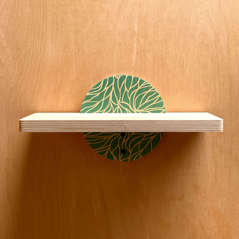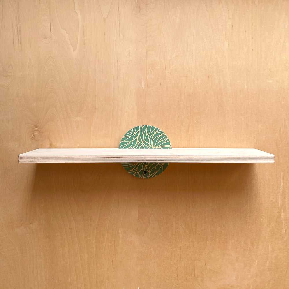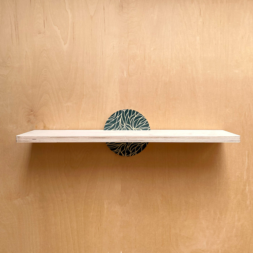 Available in three widths - 12", 24", and 36" - each shelf features a 6" deep wood panel supported by bold, circular brackets. Choose from three exclusive leaf-inspired illustrations, each adding a vibrant, nature-infused touch that transforms this functional piece into subtle wall art.