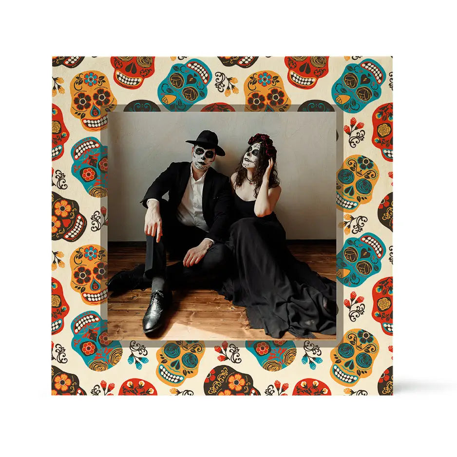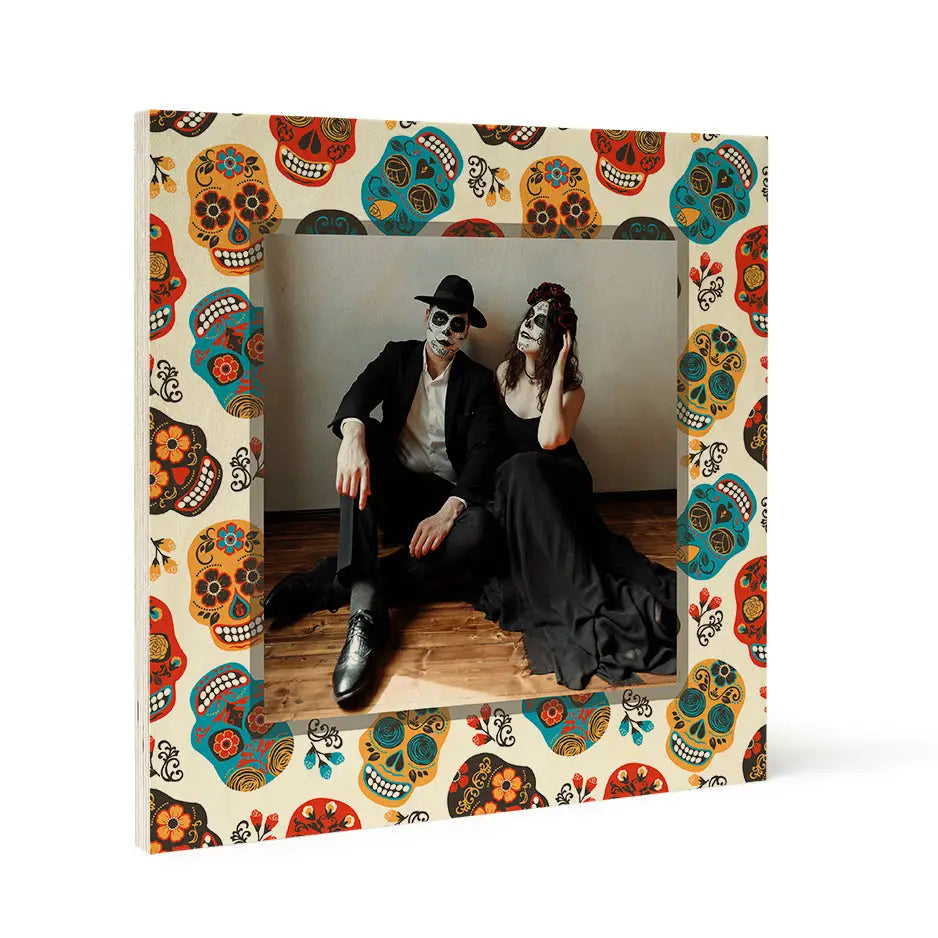 Elevate your home decor with our Dia De Los Muertos inspired Calaveras personalized wood print. This unique piece blends your cherished photos with playful and whimsical illustrations, creating an eye-catching display that is perfect for the season.